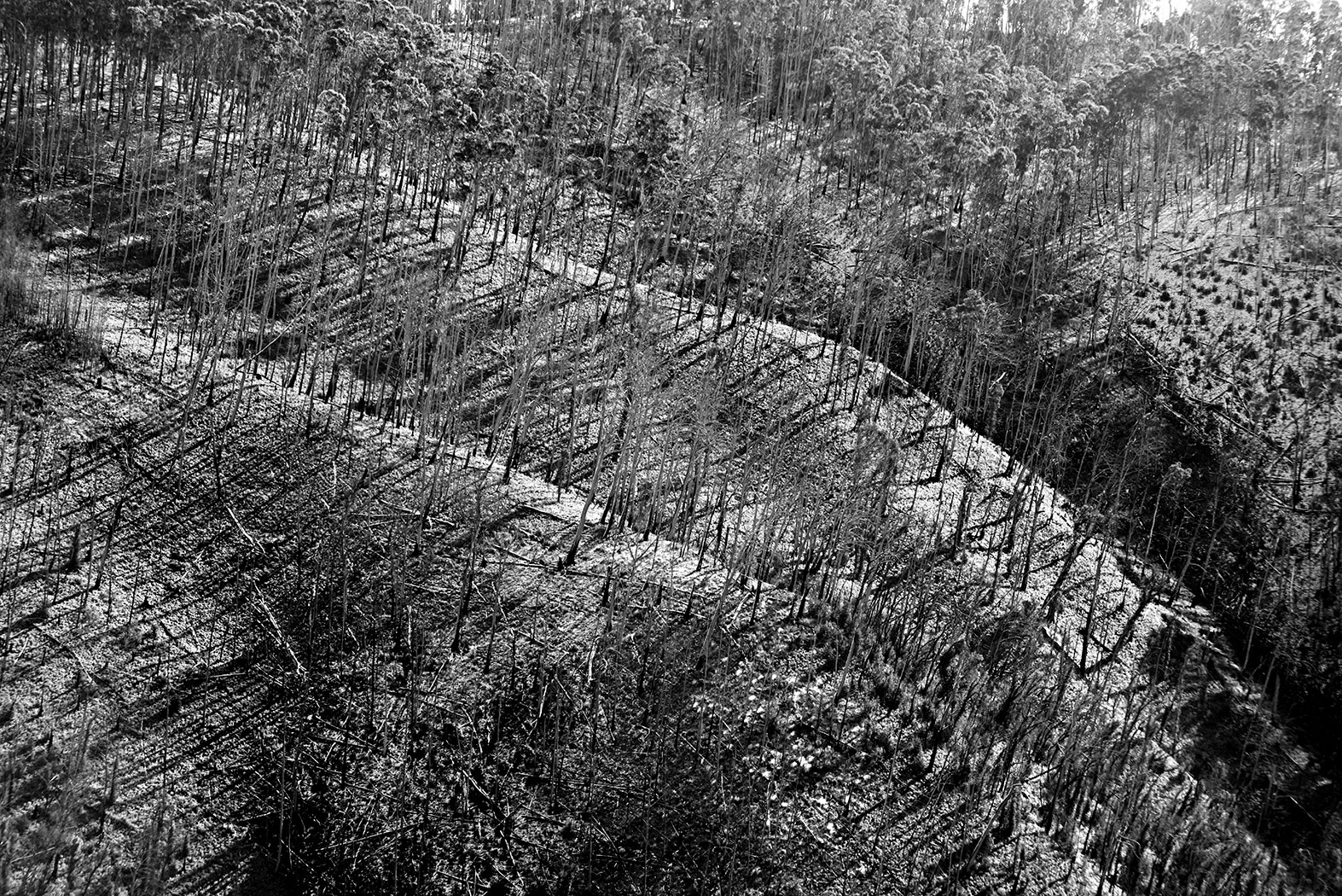 Leaning burnt branch and damaged trunks after fire, Healesville, VIC.